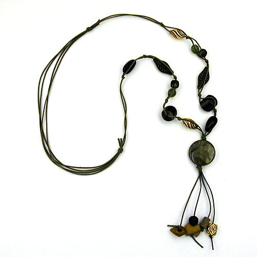Diese wunderschöne, lange, olivfarbene Modeschmuck-Kette in Y-Form passt mit ihren gedeckten Farben auch gut zur Herbst- und Wintermode. Der Mittelpunkt ist die 28mm große, dunkelolivfarbene, seidig-glänzende Kunststoff-Scheibe, die jeweils von 2 Strängen dünner olivfarbener Baumwollkordel gehalten wird, in die weitere verschiedene, khaki-oliv-braune und altgoldfarbene Kunststoffperlen kunstvoll eingeknotet wurden. Die Kette ist im Halsteil ca. 90cm lang und einkürzbar mittels Schiebeknoten auf ca. 65cm, das Y-Teil ist ca. 13cm lang. Der Hingucker sind die 4 baumelnden Strippen, die am Ende ebenfalls mit passenden Perlen verziert wurden. Die metallfreie Pullover-Kette kann ohne einen Verschluss zu öffnen über den Kopf angelegt werden. Farbiger Modeschmuck betont die Farben der Kleidung oder setzt zusätzliche Akzente.